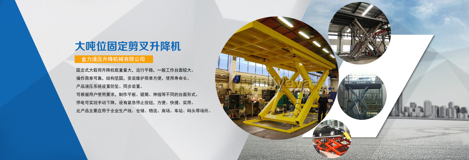 金力公司主要致力于液壓升降機械的研發,主導產品有高空作業平臺、液壓升降機、升降平臺、登車橋等十幾個系列。...